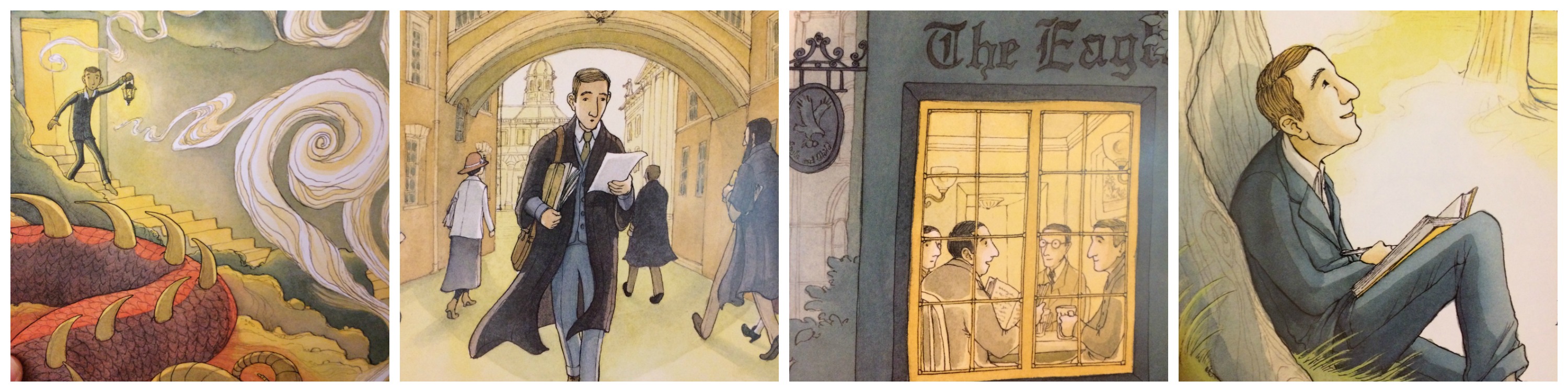 Lovely illustrations detail important events in Tolkien’s life, such as living with an aunt after the unfortunate death of his mother, meeting and marrying his wife Edith, serving as a soldier in World War I, and even meeting at the pub with fellow writer friends (their group affectionately known as the Inklings).