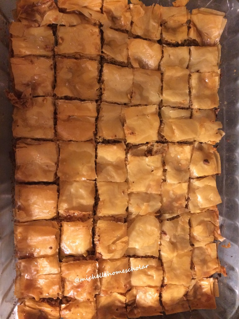 Baklava is really just layers of phyllo dough, melted butter, and a nut mixture that is baked until golden brown. A simple syrup is then poured over the baklava after it comes out of the oven. The hardest part, I think, is waiting for it to cool completely – a couple of hours seems like forever, but is really important for allowing the syrup to soak into the phyllo sheets.