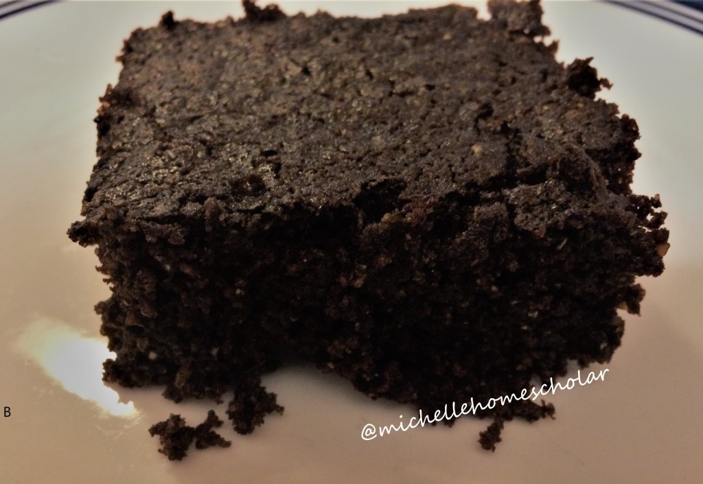 Grease baking dish (I used a glass 9″ x 12″ dish but cake pans would also work if you wanted to frost) and sprinkle with cacao powder. Pour in batter and bake 25 minutes. Check center with toothpick and bake until it comes out clean (In my glass pan, it took 35 minutes).