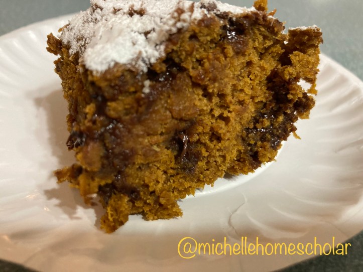 The package calls for using a 9 x 9 inch baking dish, but I used an 8 x 8 inch dish – I figured this size difference along with the higher moisture content due the canned pumpkin would add several minutes to my bake time.