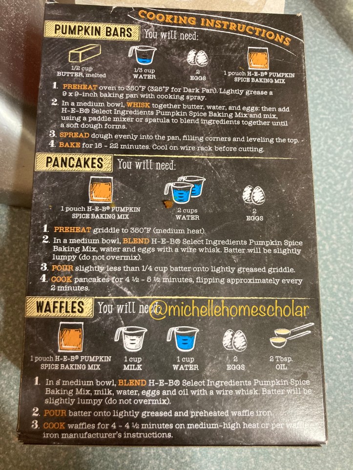 For a yummy pumpkin spice bar, I use one package of the H-E-B mix. In my stand up mixer, I combine 1/3 cup water, 1/4 cup oil (I use grapeseed oil) and 2 egg equivalents.