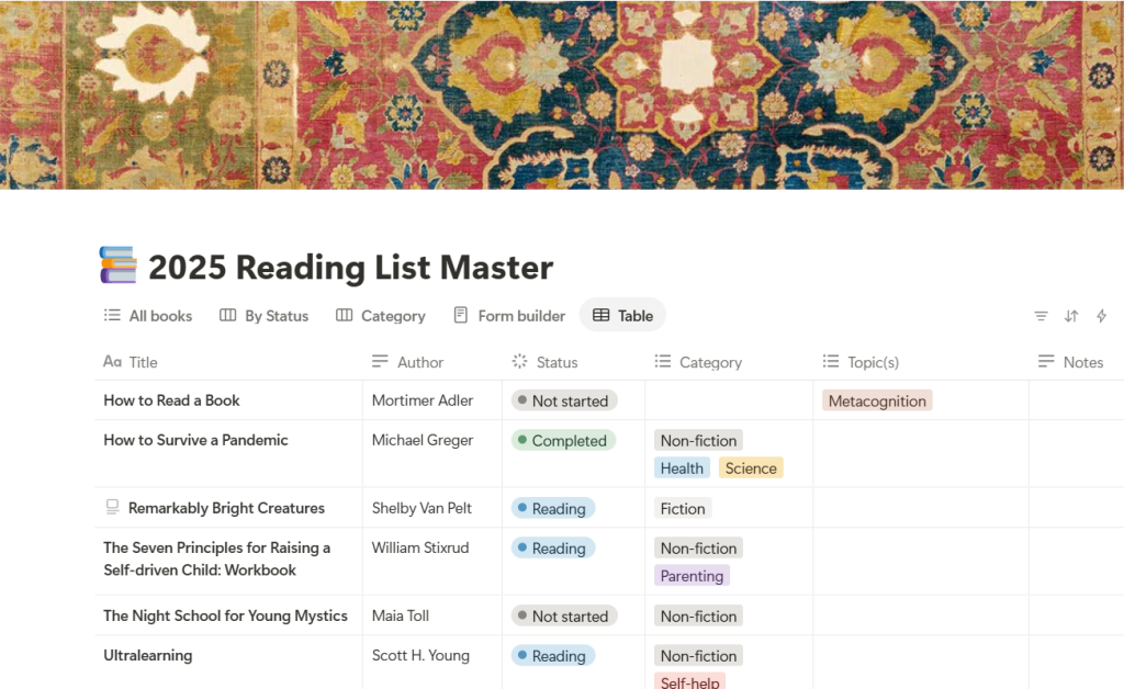- Annual Reading List: I maintain a master database for my yearly reading, currently “2025 Reading List”